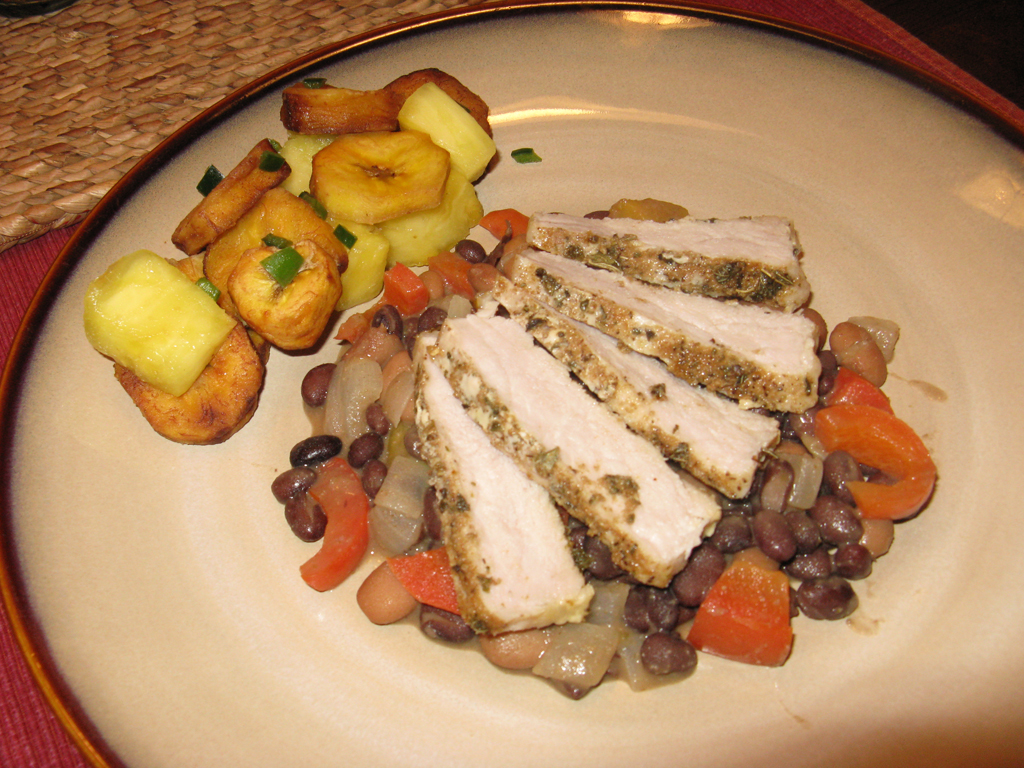 Cuban-Marinated Pork Tenderloin and Caribbean Black Beans with Plantain, Pineapple and Serrano Salsa